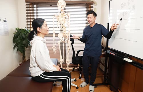 あなたの今の体の状態について説明していきます。身体がどのようなバランスになっているのか、それがどうして痛みを引き起こすのか、などをあなたに納得していただけるまでお伝えします。